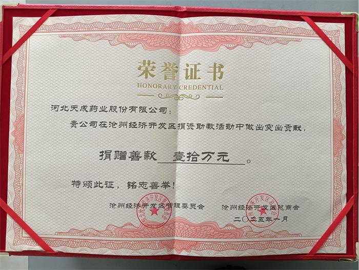 2024年,在滄州經濟開發區黨工委、管委會的引領以及市委統戰部、市工商聯的指導下,天成藥業協同園區各會員單位攜手奮進。憑借各方的共同努力,區總商會榮獲滄州市“四好”商會稱號,天成藥業也成功入圍2024河北省民營企業百強系列榜單。